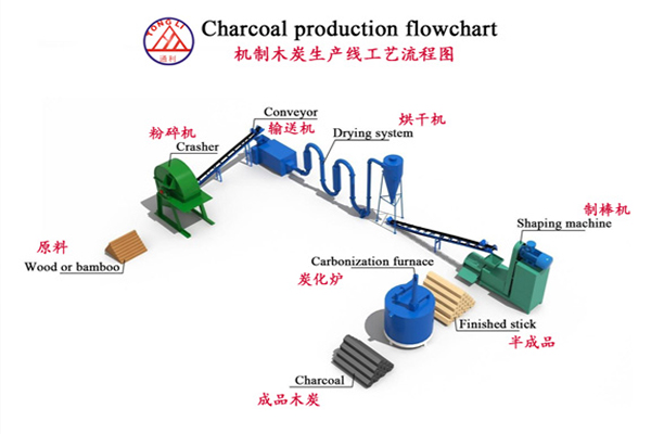 機(jī)制木炭生產(chǎn)工藝:原料——粉碎——烘干——成型——炭化——成品——裝箱——銷售 ??????????