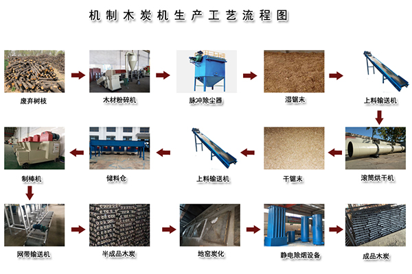機制木炭生產工藝:原料——粉碎——烘干——成型——炭化——成品——裝箱——銷售 ??????????